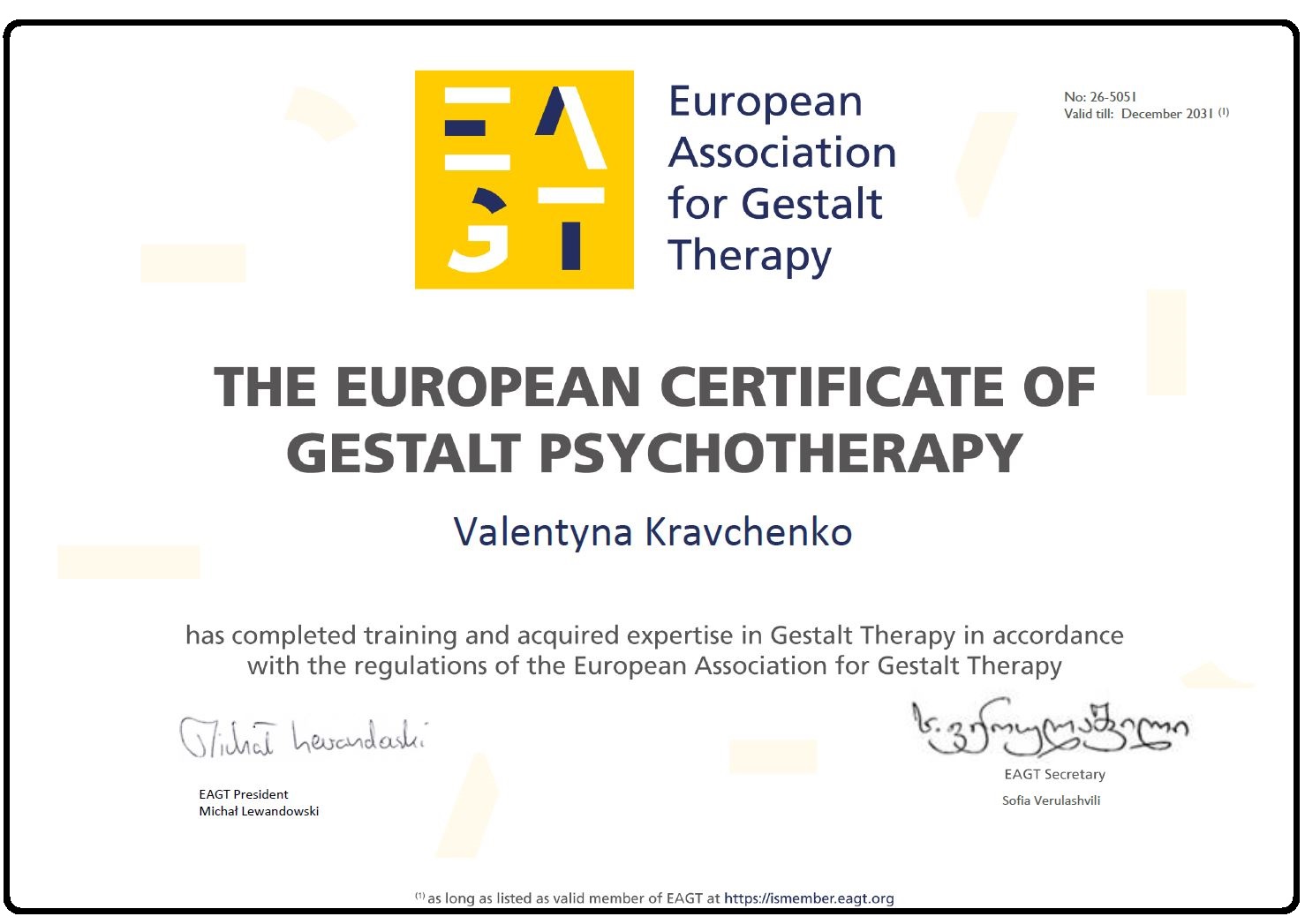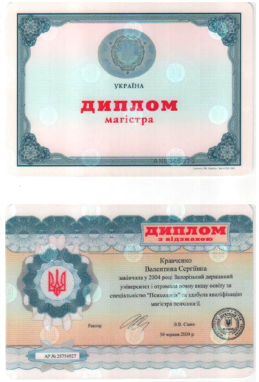 Меня зовут Валентина Кравченко, мне 37 лет. Я магистр психологии, сертифицированный гештальт терапевт. Практической психологией занимаюсь с 2004 года. Родилась в 1982 году в Запорожье, Украина. В 2004 году закончила ЗГУ (Запорожский Государственный Университет) по специальности «Психология» и получила квалификацию магистра.