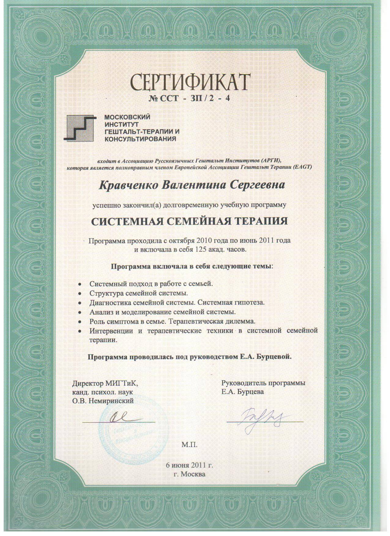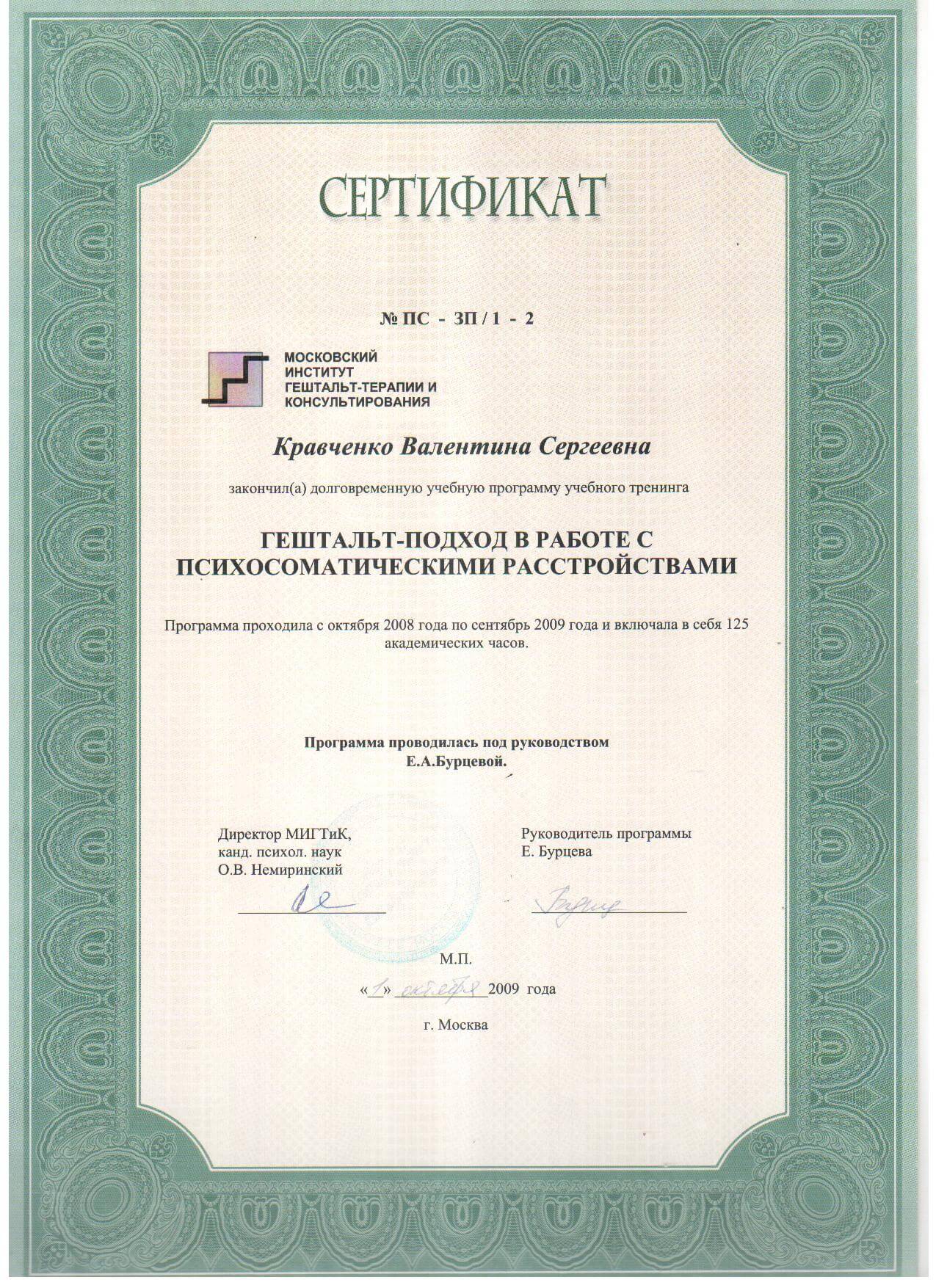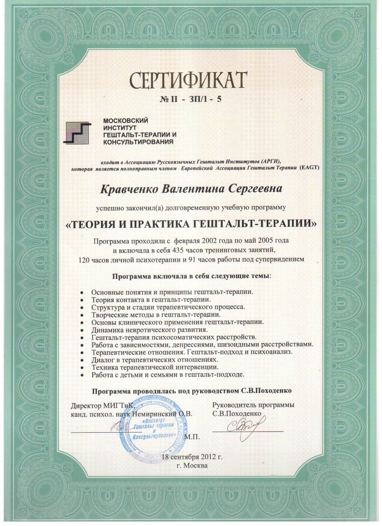 2002-2005 Московский институт Гештальт-терапии и консультирования(МИГТИК). Долговременная учебная программа по подготовке гештальт-терапевтов.